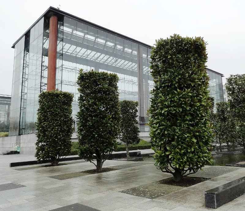 Two large Greenhouses that divide them repeatedly and geometrically set jets. And in front of them, in boxes geometrically arranged uniformly pruned Crepe-myrtles (Lagerstroemia indica).
