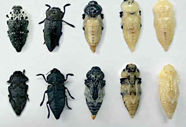 Τέλος, 3 έως 5 εβδομάδες αργότερα, οι πλαγγόνες θα μεταμορφωθούν σε ακμαία, τα οποία θα εξέλθουν αφού πρώτα τρυπήσουν τον φλοιό του κορμού του ξενιστή.